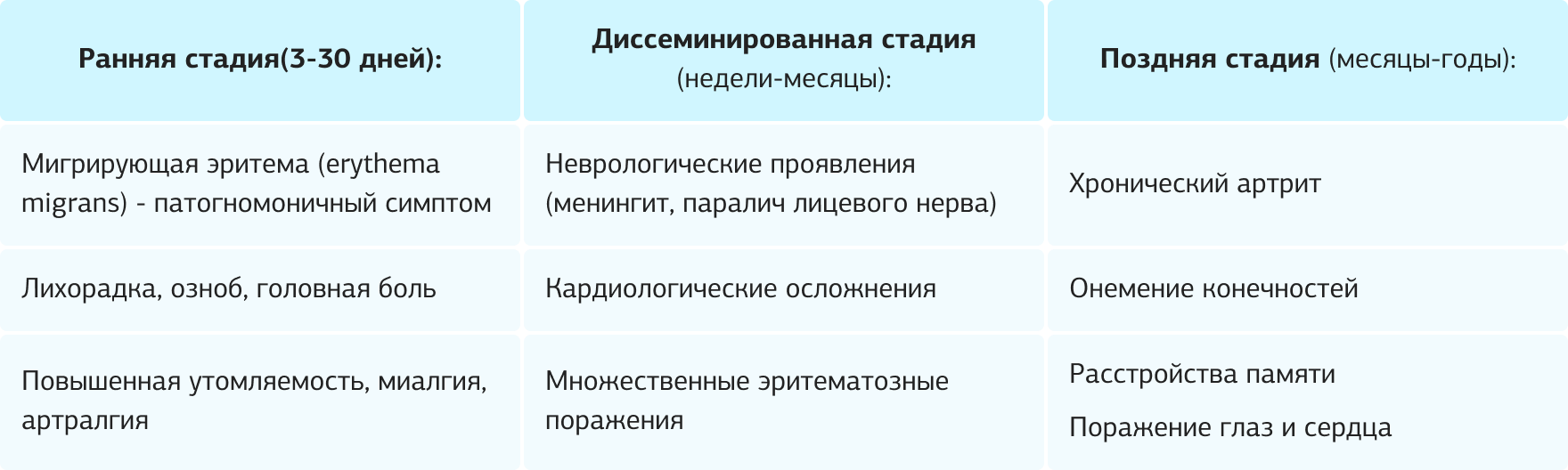 Хроническая усталость, когнитивные нарушения, рецидивирующие суставные боли могут быть проявлениями поздних стадий боррелиоза, особенно если в анамнезе есть упоминания о контакте с клещами или пребывании в лесистых местностях. Кардиологические проявления, такие как нарушение ритма или проводимости у молодых пациентов, также могут требовать исключения боррелиоза.