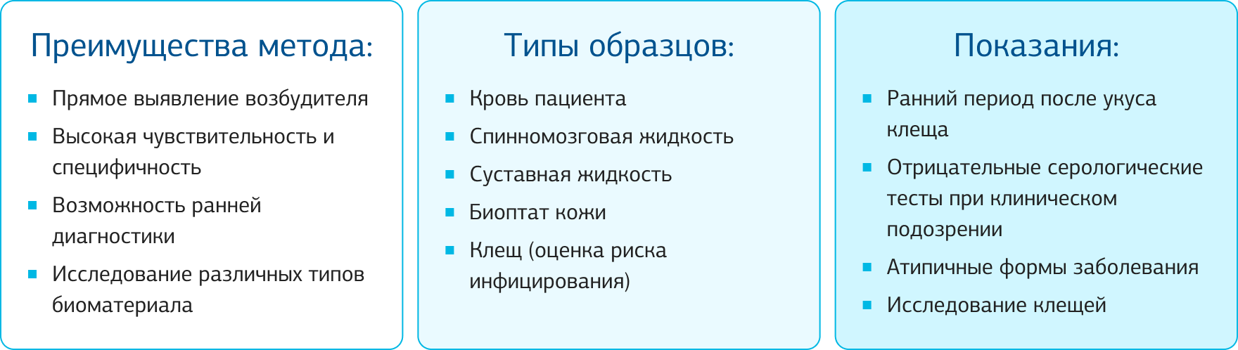 В раннем периоде, до 4 недель после укуса клеща, серологические методы могут быть малоинформативными из-за отсутствия или низкого уровня антител. В этот период наибольшую диагностическую ценность имеет ПЦР, которая позволяет выявить генетический материал возбудителя непосредственно в крови или другом биоматериале. Исследование IgM целесообразно начиная с 2-3 недели после вероятного инфицировани.