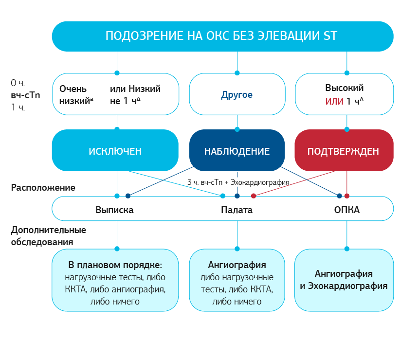 Рис. 1. 2020 год ESC. Алгоритм исключения острого коронарного синдрома без элевации ST (ОКСбпST) посредством анализа высокочувствительного тропонина (вч-сТн).