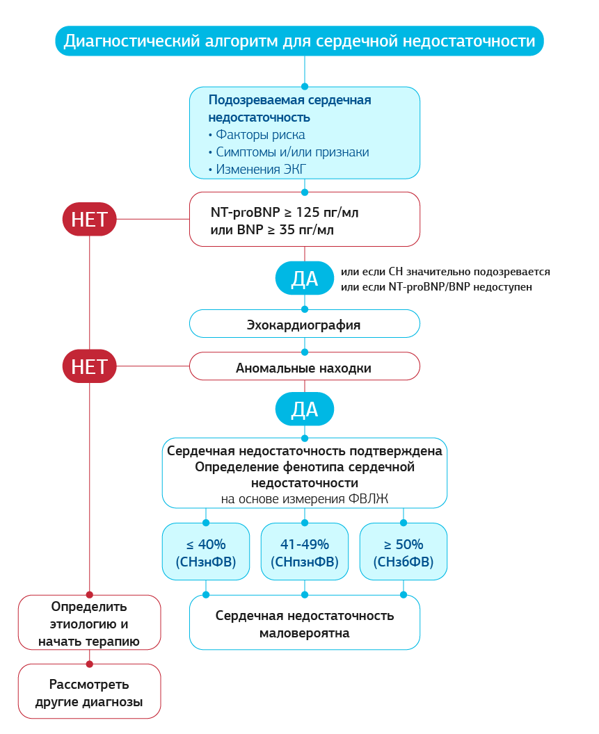 BNP/NT-proBNP в плазме крови рекомендуется использовать в качестве начального диагностического теста у пациентов с симптомами, указывающими на СН. Повышенные концентрации подтверждают диагноз СН, полезные для прогнозирования, и могут определить дальнейшую тактику диагностики.