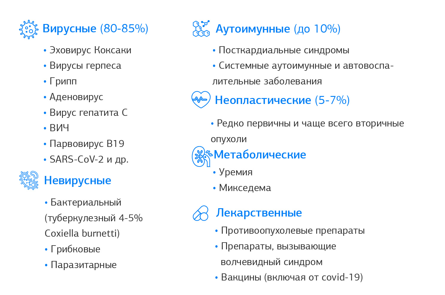 Кроме общепризнанной этиологии острого перикардита, за последние 2 года были описаны две важные новые этиологические причины. Первая – инфекционная, а именно SARS-CoV-2, а вторая – неинфекционная, а именно – вакцина против COVID-19. Точная частота перикардита у пациентов с COVID-19 неизвестна, но по данным мировой литературы при аутопсии перикардит находят примерно в 20% случаев умерших от COVID-19, а частота перикардита, обнаруживаемых с помощью МРТ сердца у пациентов после COVID-19, составляет 2 %[4].