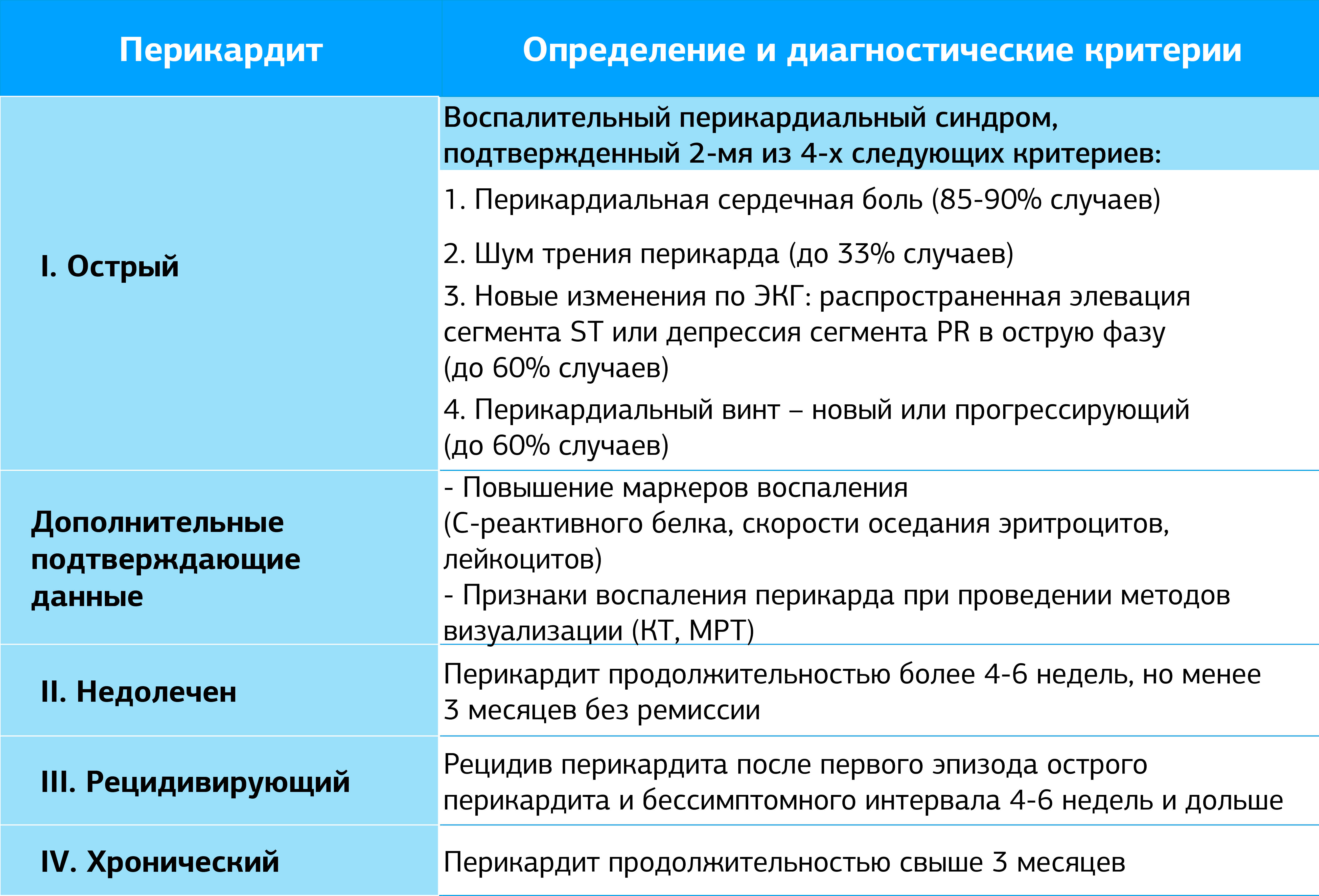 По данным Европейского общества кардиологов 2015 г. острый перикардит – это воспалительный перикардиальный синдром с/без перикардиального выпота [1]. Этот диагноз, который мы можем поставить в случае, если он подтвержден двумя из четырех перикардиальных синдромов, к которым относят: