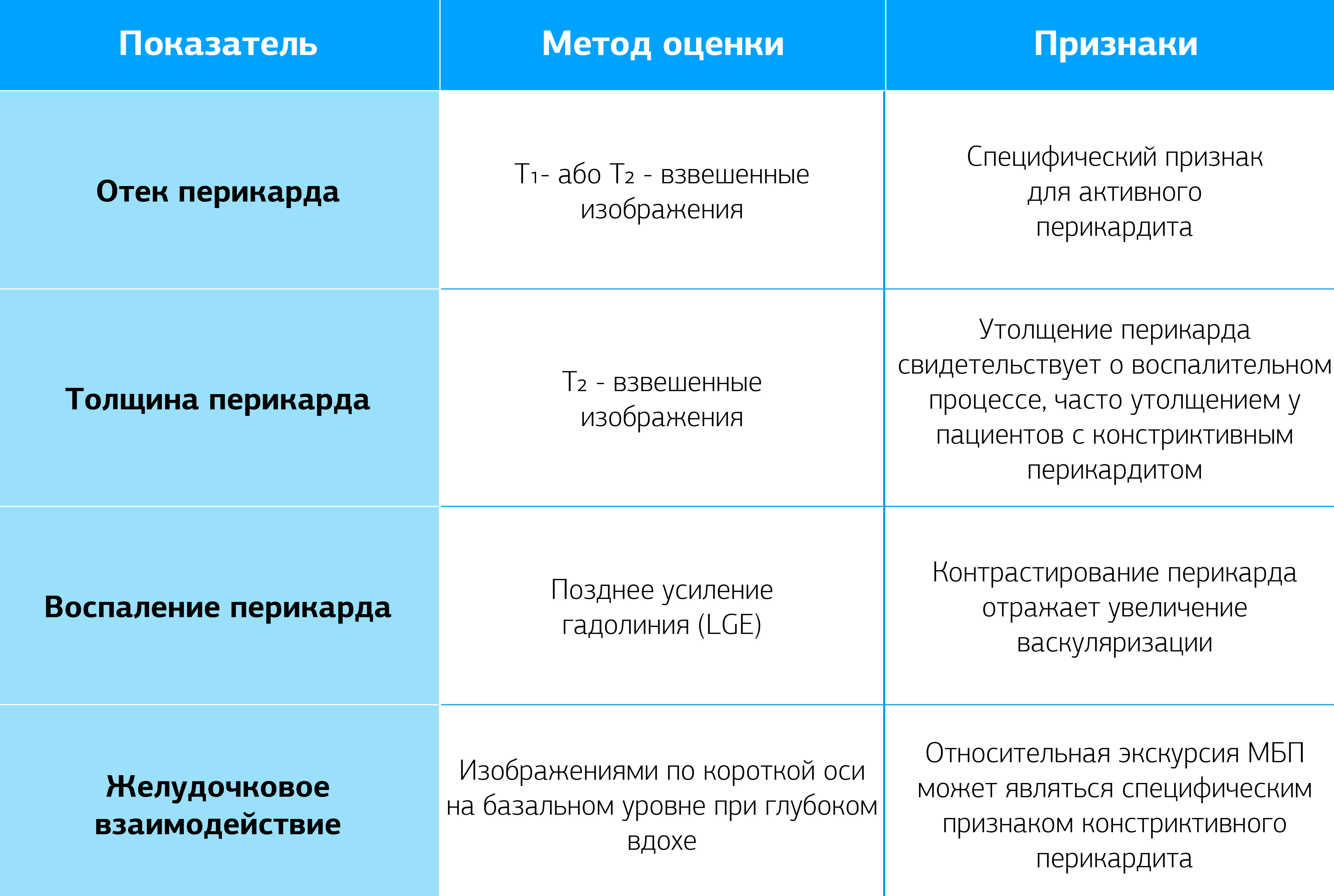 Это выявление отека, утолщение листьев и позднее контрастирование перикарда на взвешенных Т1 и Т2 изображениях. Выявление только позднего контрастирования и утолщения листьев перикарда свидетельствует о хронизации воспалительного процесса, а парадоксальное движение межжелудочковой перепонки может являться специфическим признаком констриктивного перикардита.