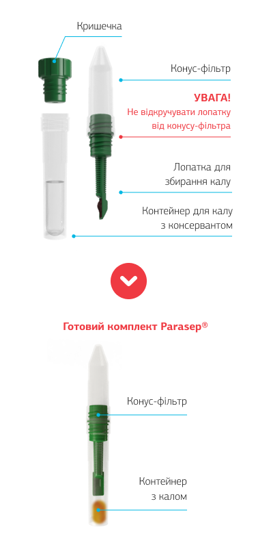 Кал принимается только в специально предназначенном контейнере Parasep® (который можно получить в любом отделении ДІЛА заранее оплатив услугу «Взятие образцов в контейнер Parasep (для кала)»). Ложкой из контейнера Parasep®, собрать 3 небольшие порции кала из разных участков (см. инструкцию ниже)Подозрительные фрагменты взрослых гельминтов желательно поместить в отдельный контейнер и сообщить персоналу отделения для применения дополнительных действий при исследовании. |