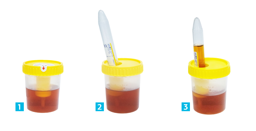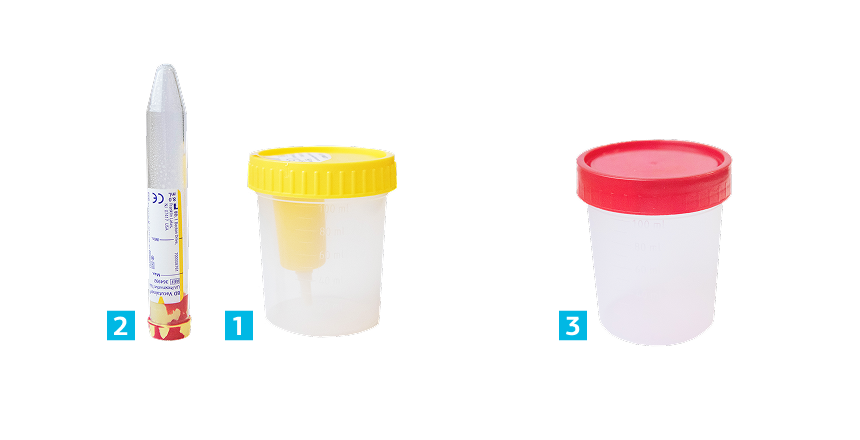 Стерильные контейнеры с адаптером (1) для сбора и вакуумные контейнеры VACUETTE (2) для доставки мочи можно получить в любом отделении ДІЛА, заранее оплатив услугу «Взятие образцов». Или можно купить в аптеке стерильный контейнер для сбора биоматериала (3), а услугу «Взятие образцов» оплатить при регистрации заказа. |