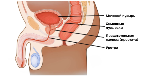 Обозначение: мочевой пузырь, семенные пузырьки, уретра, простата, раковая опухоль