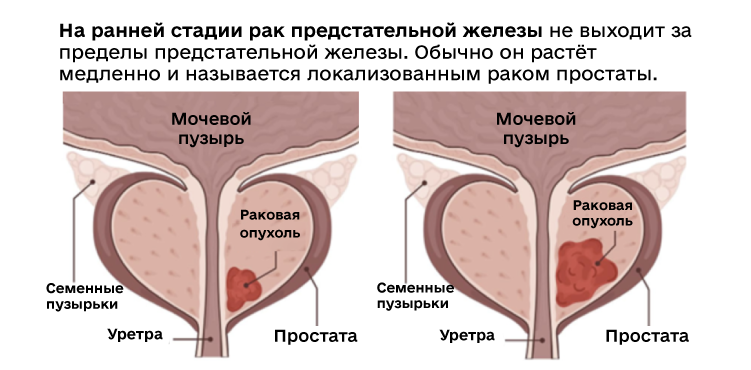 На ранней стадии рак предстательной железы не распространяется за пределы предстательной железы. Обычно он растет медленно и называется локализованным раком простаты.