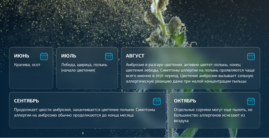 Цветение сорняков продолжается с июня по октябрь, но наибольший пик приходится на август-сентябрь.