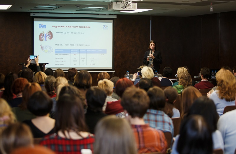 Бурка Ольга Анатольевна, к.м.н., доцент кафедры акушерства-гинекологии № 1 Национального медицинского университета имени А. А. Богомольца, научный консультант МЛ ДІЛА в своем докладе осветила патогенетические основания применения исследований ФСГ, эстрадиол, АМГ у женщин, ЛГ, общий ТСТ, ДГЭАС у мужчин на этапе скрининга при обследовании пациентов с инсулинорезистентностью. Также Ольга Анатольевна подробно остановилась на алгоритмах диагностики СПКЯ в практике эндокринолога. Алгоритмы скрининга, диагностики и мониторинга эффективности лечения были приведены на конкретных клинических случаях. Спикер отметила, что по показаниям для оценки биологической значимости гиперпролактинемии и выбор оптимальной лечебной тактики следует проводить исследования «Пролактин, молекулярные формы», исследование АМГ помогает обобщить оценку состояния репродуктивной функции женщин в различные возрастные периоды, при исследовании АМГ необходимо исключить недостаточность (дефицит) 25 ОН витамина D как важный фактор влияния на репродуктивную функцию женщины. Спикер подчеркнула - при выявлении отклонений в показателях функционирования репродуктивной системы, прежде чем принять решение о применении препаратов гормонов, следует провести повторное обследование, учитывая вариабельность функционирования женской половой системы в различных менструальных циклах.