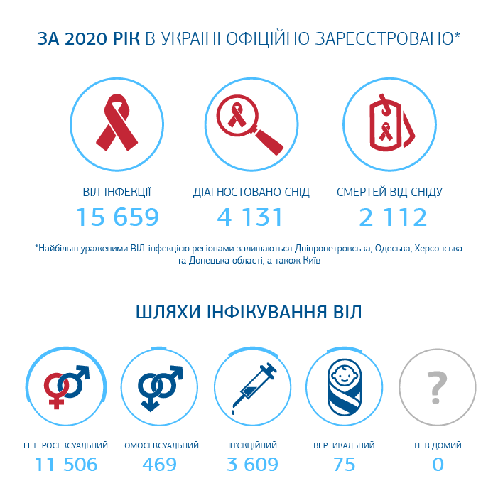 Наиболее пораженными ВИЧ-инфекцией украинскими регионами остаются Днепропетровская, Одесская, Донецкая области, а также Киев. Там зарегистрировано наибольшее количество случаев ВИЧ-инфекции, СПИДа и смертей, обусловленных СПИДом среди всех регионов Украины. Самыми распространенными путями передачи ВИЧ/СПИДа в 2020 году остаются: